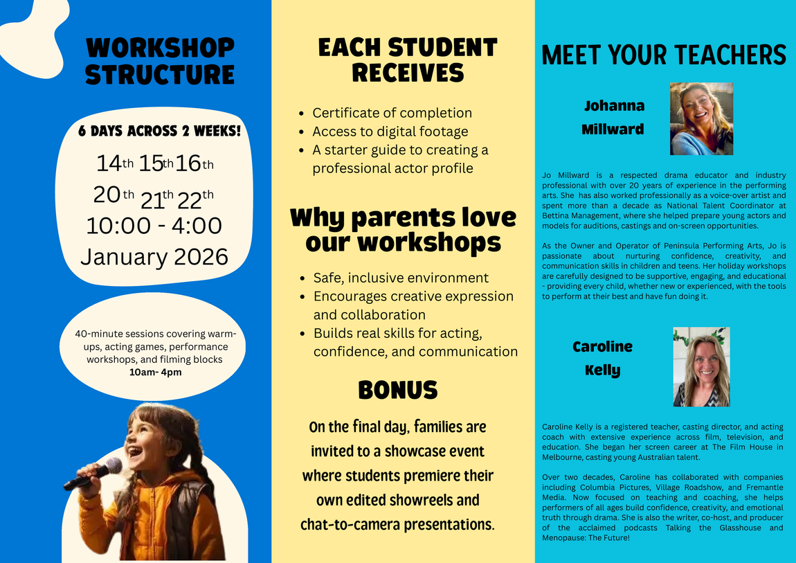 Convenors: Johanna Millward and Caroline Kelly - VIT Registered Drama Teachers with professional film and TV casting and production experience